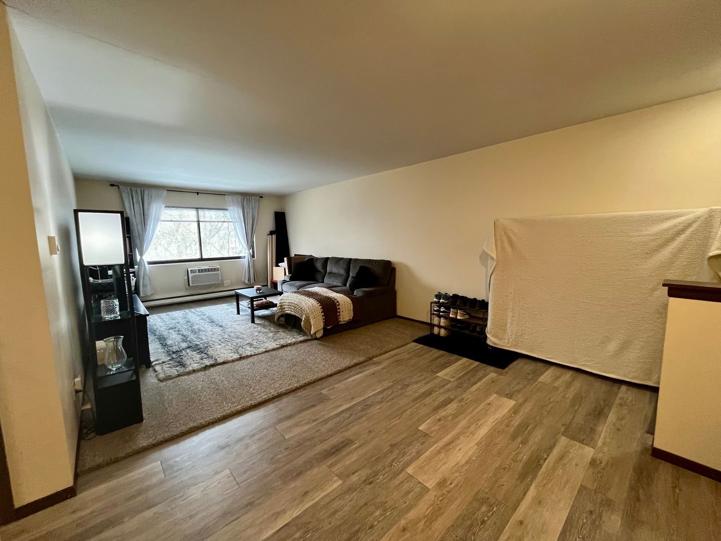 Large open concept 1 bed 1 bath. Large windows in each room offer excellent airflow and let in a bunch of natural light! Built in A/C keeps the whole unit cool in the warmer months. Carpeting keeps all units nice and quiet! Coin-op laundry in building!