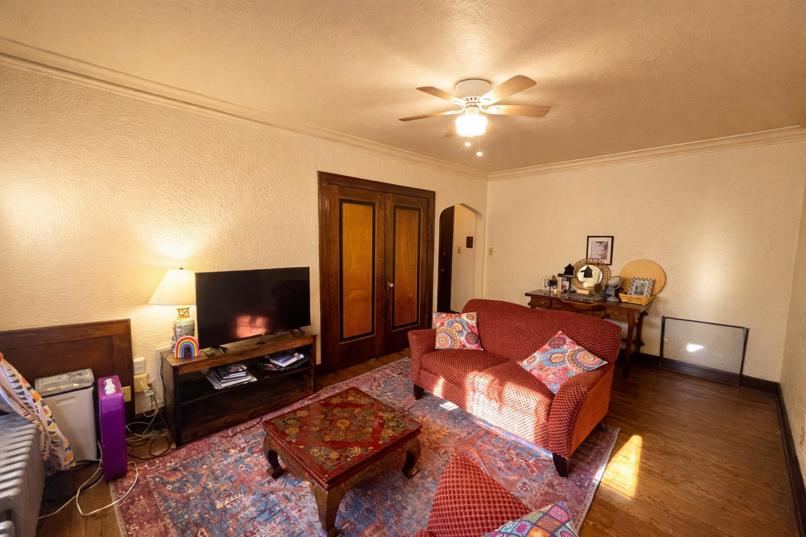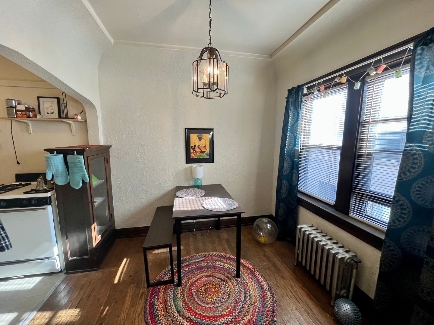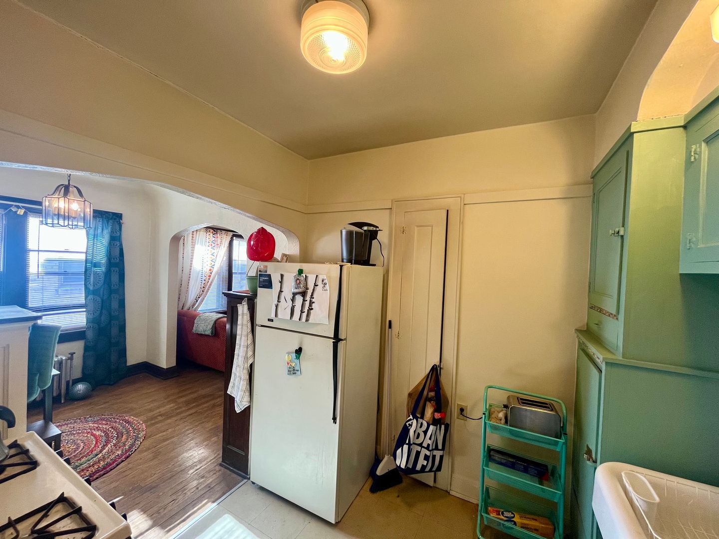 This spacious unit features vintage details, hardwood floors, a kitchen with tons of storage space, a dining area, big closets, a large living room and a cozy bedroom.