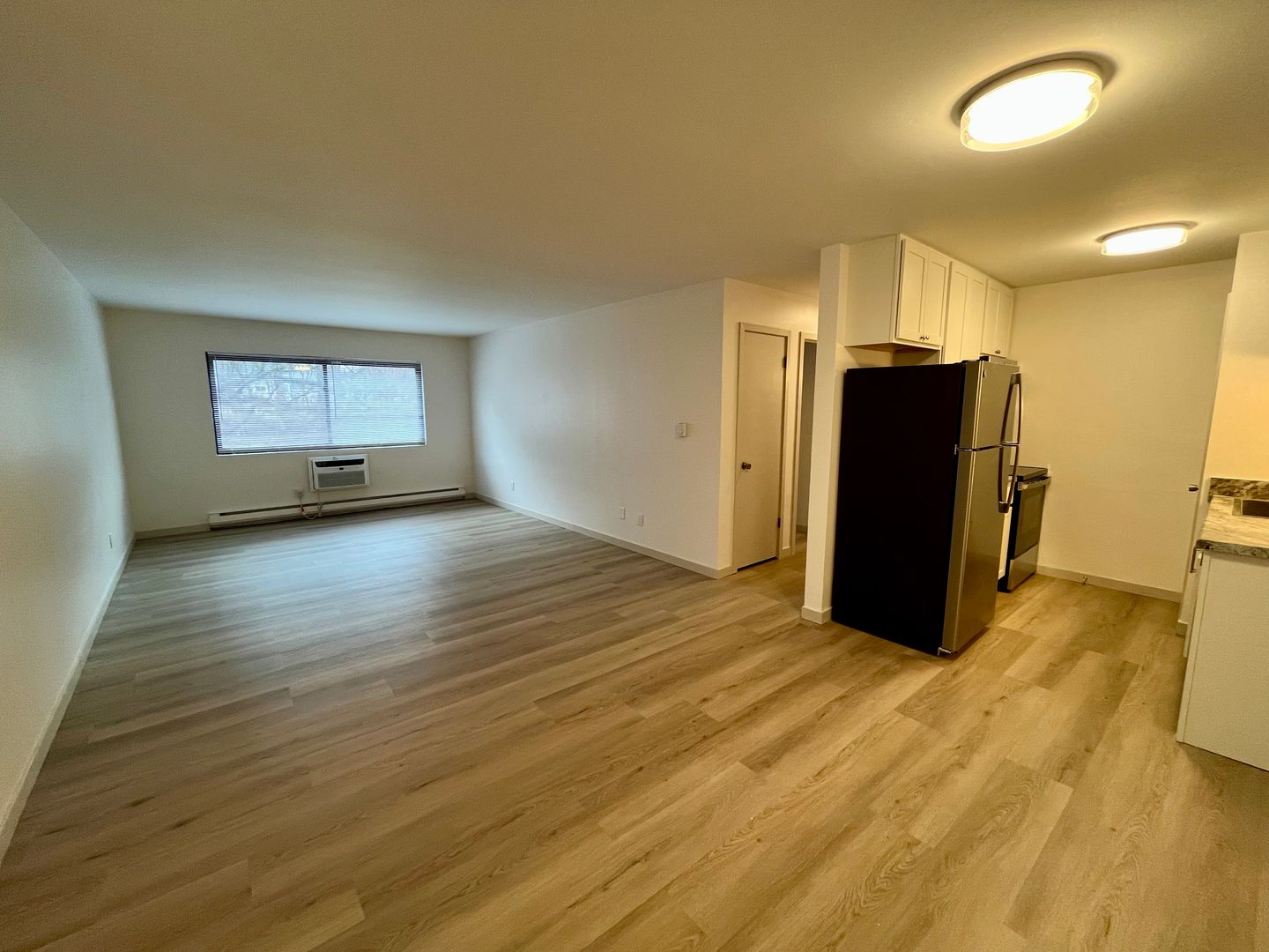 Newly Updated open concept 1 bed 1 bath. Large windows in each room offer excellent airflow and let in a bunch of natural light! Built in A/C keeps the whole unit cool in the warmer months. Carpeting keeps all units nice and quiet! Coin-op laundry in building!