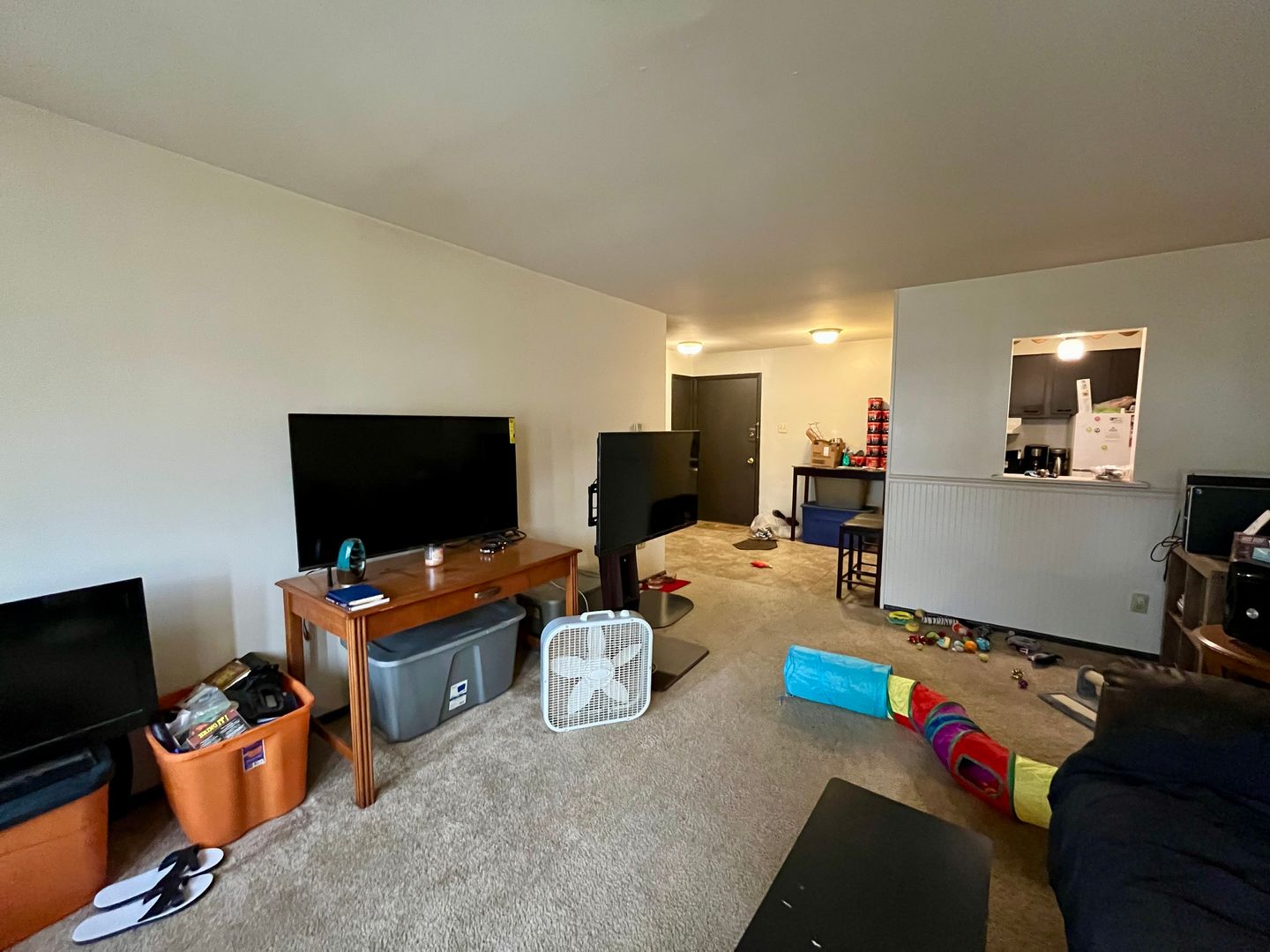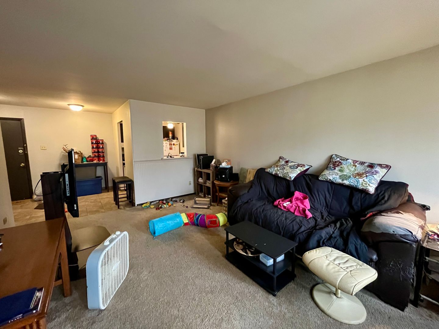 The living room offers a welcoming area to relax or entertain, with natural light that helps create an open feel. The kitchen includes practical cabinet storage and a straightforward layout for everyday use. The bathroom is clean and well-maintained.