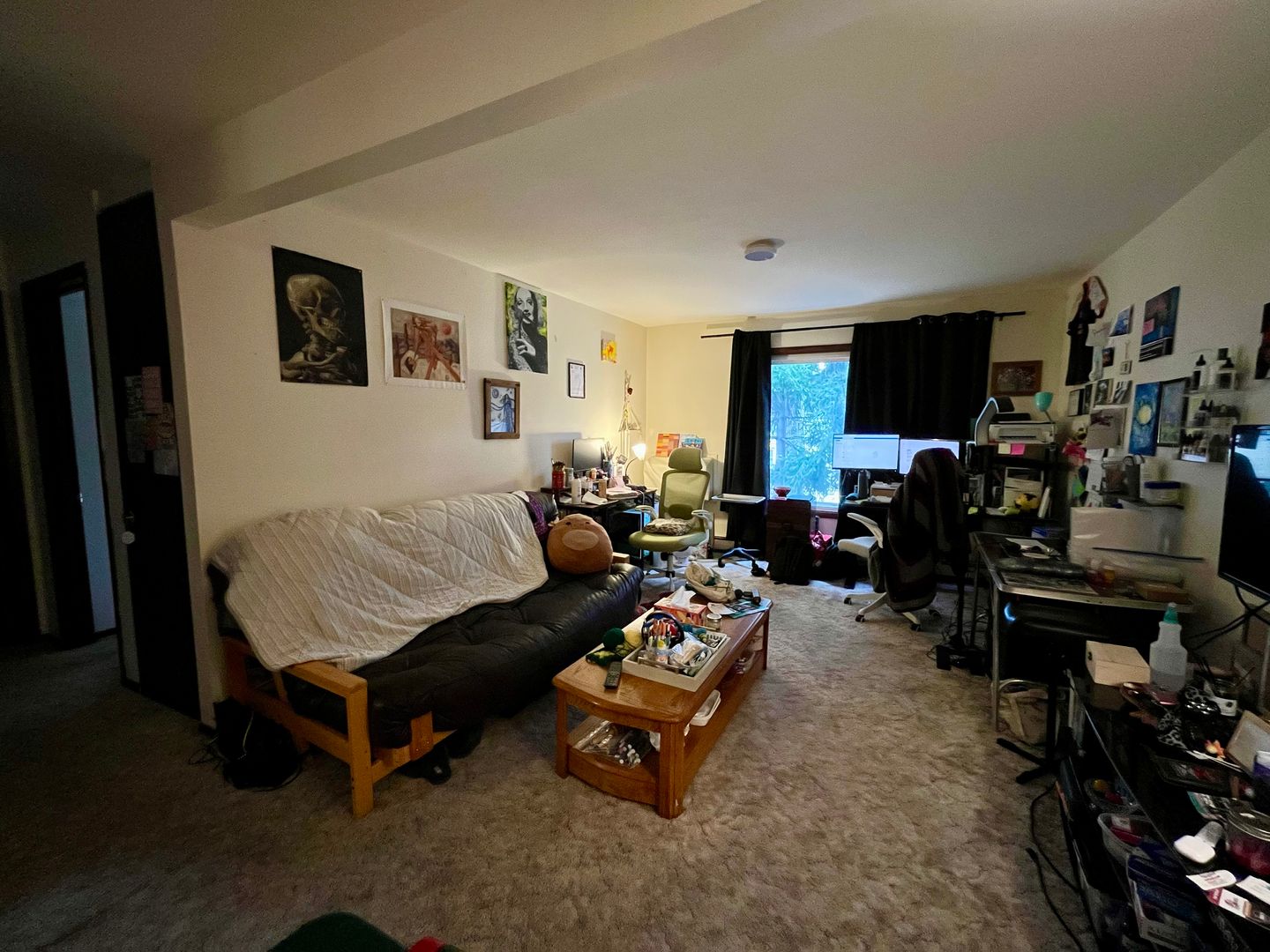 Large open concept 1 bed with large windows in each room offer excellent airflow and let in a bunch of natural light! Built in A/C keeps the whole unit cool in the warmer months. Carpeting keeps all units nice and quiet! Coin-op laundry in building and off street parking offered!